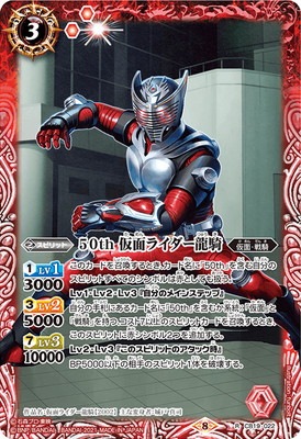自分の手札にあるカード名に「50th」を含むか系統:「仮面」と「戦騎」を持つ、コスト7以上のスピリットカードを召喚するとき、このスピリットに赤シンボル2つを追加する。