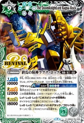 終焉しゅうえんの騎神きしんラグナ・ロック/ The DoomKnightLord Ragna-Rock スピリット 9(緑3白3)/緑白/戦騎・殻人・武装 <1>Lv1 10000 <2>Lv2 12000 <5>Lv3 18000 自分の手札/手元にあるこのカードは、自分のカード名:「鉄騎皇イグドラシル」がアタックしたとき、コストを支払わずに召喚できる。 フラッシュ【アクセル】コスト5(緑2白2)(この効果は手札から使用できる) 相手のスピリットすべてを疲労させる。 この効果発揮後、このカードはオープンして手元に置く。 Lv1・Lv2・Lv3『このスピリットの召喚時』 ボイドからコア6個をこのスピリットに置く。 Lv2・Lv3『このスピリットのアタック/ブロック時』 ターンに1回、このスピリットは回復する。 シンボル:緑白 コンセプト:今石進 イラスト:斉藤和衛 フレーバーテキスト: 我ら秩序軍の伝説の守護神だ!!