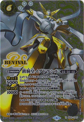 鉄騎皇てっきおうイグドラシル/The IronKnight Yggdrasill スピリット 6(3)/白/動器・戦騎・武装 <1>Lv1 5000 <2>Lv2 10000 Lv1・Lv2『このスピリットの召喚時』 次の自分のスタートステップまで、系統:「武装」を持つ自分のスピリットすべては相手の効果を受けない。 Lv1・Lv2『このスピリットの破壊時』 ターンに1回、相手のスピリット/アルティメット1体を手札に戻すことで、このスピリットは同じ状態でフィールドに残る。 Lv2『このスピリットのアタック時』 BP3000以下の相手のスピリットすべてを手札に戻す。 シンボル:白 コンセプト:今石進 イラスト:斉藤和衛 フレーバーテキスト: 虚神の一撃を跳ね返した!! まさに鉄壁の守り!!
