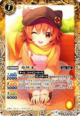 このスピリットを、アタックするかわりにデッキの下に戻すことで、自分の手札/手元の系統:「衣装」を持つ「カサネ」1枚を、コストを支払わずに召喚し、自分はデッキから1枚ドローする。