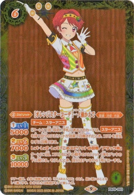 [オレンジスターコーデ]一ノ瀬いちのせかえで スピリット 6(3)/黄/星麗・詩姫・衣装 <1>Lv1 5000 <2>Lv2 7000 <3>Lv3 10000 【チーム:スターアニス】 〔ターンに1回:同名〕手札にあるこのカードは、【スターアニス】を持つ自分のスピリットが効果で召喚されたとき、コストを支払わずに召喚できる。 Lv1・Lv2・Lv3『このスピリットの召喚/アタック時』 ターンに1回、コスト6以下の相手のスピリット1体をデッキの下に戻せる。 そうしたとき、自分はデッキから1枚ドローする。 シンボル:黄 イラスト:石川恵理 イラスト:橋口隼人 フレーバーテキスト: ツアー前日、全員で旅館に泊まる「STAR☆ANIS」の8人。思い思いのことを して過ごす中、かえでたちは枕投げをして楽しんだ。