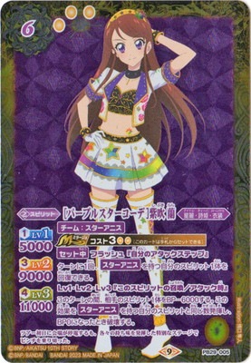 [パープルスターコーデ]紫吹しぶき 蘭らん スピリット 6(3)/黄/星麗・詩姫・衣装 <1>Lv1 5000 <3>Lv2 9000 <4>Lv3 11000 【チーム:スターアニス】 【ミラージュ:コスト3(2)(このカードは手札からセットできる)】 【セット中】フラッシュ『自分のアタックステップ』 ターンに1回、【スターアニス】を持つ自分のスピリット1体を回復できる。 Lv1・Lv2・Lv3『このスピリットの召喚/アタック時』 このターンの間、相手のスピリット1体をBP-6000する。 この効果を【スターアニス】を持つ自分のスピリットと同じ数発揮し、BP0になったとき破壊する。 シンボル:黄 イラスト:橋口隼人 フレーバーテキスト: ツアー初日に会場が停電するも、各々の持ち味を発揮した特別なステージで ピンチを乗り切った。