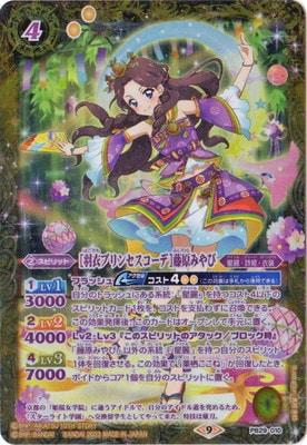 [羽衣はごろもプリンセスコーデ]藤原ふじわらみやび† スピリット 4(2)/黄/星麗・詩姫・衣装 <1>Lv1 3000 <2>Lv2 4000 <4>Lv3 7000 フラッシュ【アクセル】コスト4(2)(この効果は手札から使用できる) 自分のトラッシュにある系統:「星麗」を持つコスト4以下のスピリットカード1枚を、コストを支払わずに召喚できる。 この効果発揮後、このカードはオープンして手元に置く。 Lv2・Lv3『このスピリットのアタック/ブロック時』 「藤原みやび」以外の系統:「星麗」を持つ自分のスピリット1体を回復させる。 この効果で「栗栖ここね」が回復したとき、ボイドからコア1個を自分のスピリットに置く。 シンボル:黄 イラスト:真時未砂 フレーバーテキスト: 京都の「姫桜女学院」に通うアイドルで、自分のアイドル道を究めるため、 「スターライト学園」へ交換留学生としてやって来た。特技は薙刀。