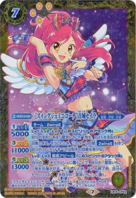 [スイングジェミニコーデ]音城おとしろセイラ スピリット 7(4)/黄/星麗・詩姫・衣装 <1>Lv1 5000 <3>Lv2 11000 <5>Lv3 13000 【チーム:2wingS】 Lv1・Lv2・Lv3『このスピリットのアタック時』 自分の手札にある「星宮いちご」1枚を、コストを支払わずに召喚できる。 そうしたとき、このターンの間、【2wingS】を持つ自分のスピリットすべては相手の効果を受けない。 Lv2・Lv3【星座アピール】『このスピリットのアタック時』 自分の[ソウルコア]をトラッシュに置くことで、自分の「星宮いちご」1体を回復させる。 そうしたとき、バトル終了時、自分のトラッシュの[ソウルコア]を自分の「星宮いちご」に置く。 シンボル:黄 イラスト:はんざわかおり フレーバーテキスト: 「スイングジェミニコーデ」は、ふたご座のドレス。このドレスは、WMを 超えるため、2つのブランドの二人のデザイナーによって作られた。
