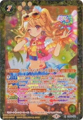 [リゾートキャンサーコーデ]夏樹なつきみくる スピリット 7(4)/黄/星麗・詩姫・衣装 <1>Lv1 6000 <2>Lv2 8000 <3>Lv3 11000 Lv1・Lv2・Lv3『このスピリットの召喚時』 自分のトラッシュにあるマジックカード1枚を手札に戻せる。 または、自分のデッキを上から3枚オープンできる。 その中のマジックカードすべてを手札に加える。 残ったカードは破棄する。 Lv2・Lv3【星座アピール】『このスピリットのアタック時』 ターンに1回、このスピリットの[ソウルコア]をトラッシュに置くことで、自分の手札にある黄のマジックカード1枚のフラッシュ効果を、コストを支払わずにただちに使用し、このスピリットは回復する。 シンボル:黄 イラスト:ue フレーバーテキスト: 「リゾートキャンサーコーデ」は、かに座の星座プレミアムレアドレス。
