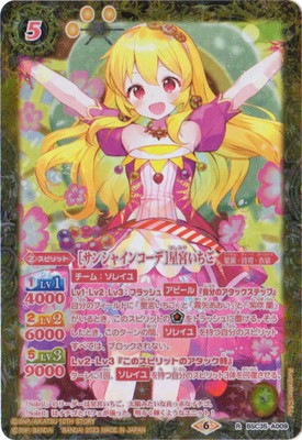 [サンシャインコーデ]星宮ほしみやいちご スピリット 5(3)/黄/星麗・詩姫・衣装 <1>Lv1 4000 <2>Lv2 6000 <5>Lv3 9000 【チーム:ソレイユ】 Lv1・Lv2・Lv3:フラッシュ【アピール】『自分のアタックステップ』 自分のフィールドに「星宮いちご」と「霧矢あおい」と「紫吹 蘭」がいるとき、このスピリットの[ソウルコア]をトラッシュに置ける。 そうしたとき、このターンの間、【ソレイユ】を持つ自分のスピリットすべては、ブロックされない。 Lv2・Lv3『このスピリットのアタック時』 ターンに1回、【ソレイユ】を持つ自分のスピリット3体を回復させる。 シンボル:黄 イラスト:にもし フレーバーテキスト: 「Soleil」のリーダーは星宮いちご。太陽みたいな真っ赤なイチゴ。 「Soleil」はイチゴとパフェが揃った、明るく輝くようなユニット!