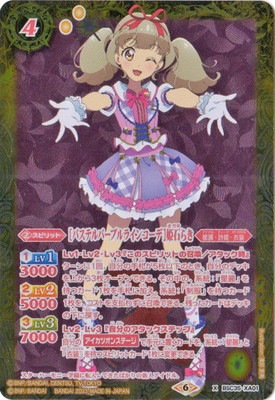 [パステルパープルラインコーデ]姫石きせきらき スピリット 4(2)/黄/星麗・詩姫・衣装 <1>Lv1 3000 <2>Lv2 5000 <3>Lv3 7000 Lv1・Lv2・Lv3『このスピリットの召喚/アタック時』 ターンに1回、自分の手札が5枚以下のとき、自分のデッキを上から3枚オープンできる。 その中の、系統:「星麗」を持つカード1枚を手札に加え、系統:「制服」を持つカード1枚を、コストを支払わずに召喚できる。 残ったカードはデッキの下に戻す。 Lv2・Lv3『自分のアタックステップ』 自分の【アイカツオンステージ】で手元に置くカードを、系統:「星麗」と「衣装」を持つスピリットカード1枚に変更できる。 シンボル:黄 イラスト:渡部里美 フレーバーテキスト: スターハーモニー学園に転入してきたばかりの新人アイドル。