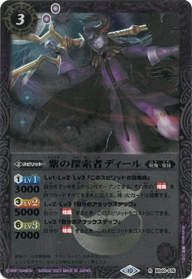 紫むらさきの探索者たんさくしゃディール スピリット 3(2)/紫/呪鬼・夜族 <1>Lv1 3000 <3>Lv2 5000 <6>Lv3 7000 Lv1・Lv2・Lv3『このスピリットの召喚時』 自分のデッキを上から3枚オープンできる。 その中の《煌臨》を持つカードすべてを手札に加える。 残ったカードは破棄する。 Lv2・Lv3『自分のアタックステップ』 自分が《煌臨》するとき、このスピリットをコスト5にできる。 Lv3『自分のアタックステップ』 自分が《煌臨》するとき、このスピリットをコスト6にできる。 シンボル:紫 イラスト:藤原ひさし フレーバーテキスト: 護衛の一人は魔術師。ナルシストにしかみえないのに、 とってもガサツ。せめて攻撃呪文は狙って撃とうよ。