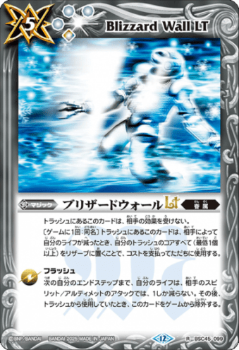 〔ゲームに1回:同名〕トラッシュにあるこのカードは、相手によって自分のライフが減ったとき、自分のトラッシュのコアすべて(最低1個以上)をリザーブに置くことで、コストを支払ってただちに使用する。